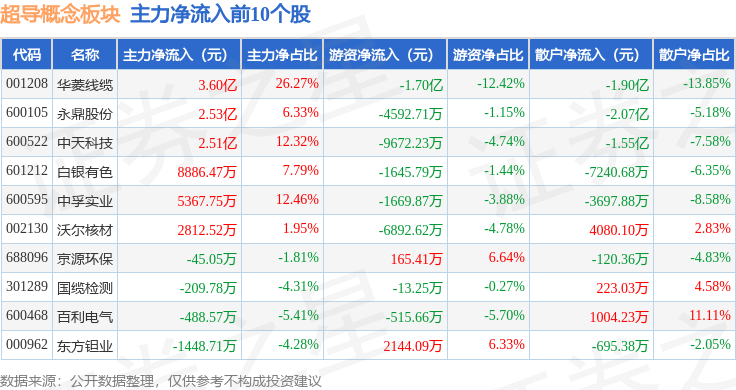 从资金流向上来看,当日超导概念板块主力资金净流入6.09亿元,游资资金净流出2.15亿元,散户资金净流出3.94亿元。超导概念板块个股资金流向见下表:
