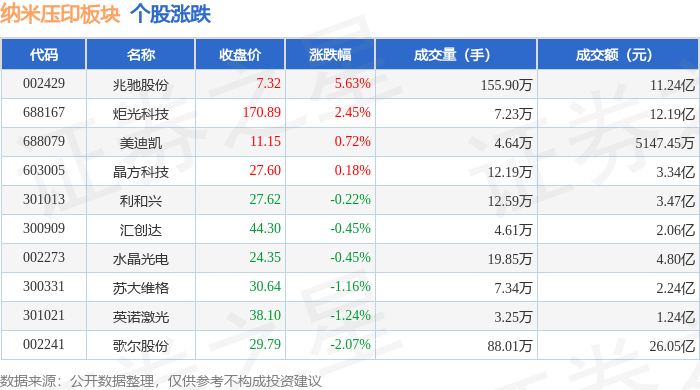 证券之星消息,12月10日纳米压印板块较上一交易日下跌0.05%,歌尔股份领跌。当日上证指数报收于3900.5,下跌0.23%。深证成指报收于13316.42,上涨0.29%。纳米压印板块个股涨跌见下表: