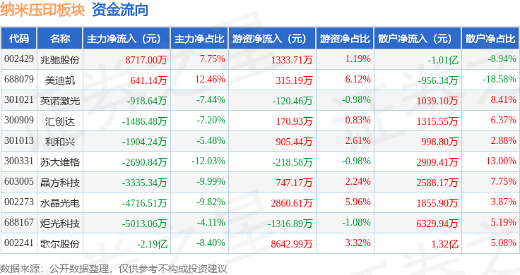 从资金流向上来看,当日纳米压印板块主力资金净流出3.26亿元,游资资金净流入1.33亿元,散户资金净流入1.93亿元。纳米压印板块个股资金流向见下表: