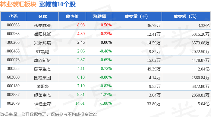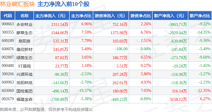 从资金流向上来看,当日林业碳汇板块主力资金净流出6169.54万元,游资资金净流入5262.34万元,散户资金净流入907.2万元。林业碳汇板块个股资金流向见下表: