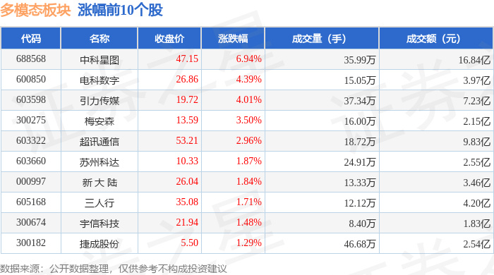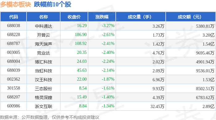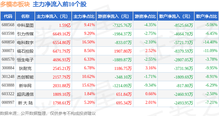 从资金流向上来看,当日多模态板块主力资金净流出5.6亿元,游资资金净流出6968.16万元,散户资金净流入6.29亿元。多模态板块个股资金流向见下表: