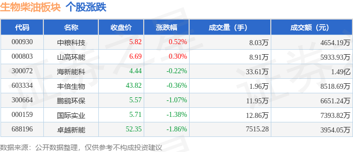 证券之星消息,12月10日生物柴油板块较上一交易日下跌0.36%,卓越新能领跌。当日上证指数报收于3900.5,下跌0.23%。深证成指报收于13316.42,上涨0.29%。生物柴油板块个股涨跌见下表: