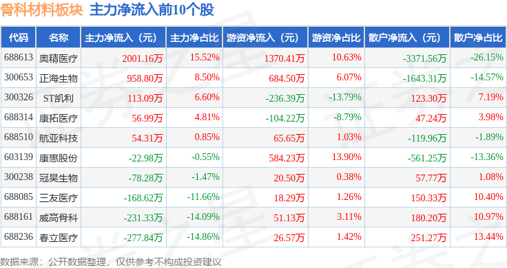 从资金流向上来看,当日骨科材料板块主力资金净流出1.06亿元,游资资金净流入2988.85万元,散户资金净流入7632.64万元。骨科材料板块个股资金流向见下表: