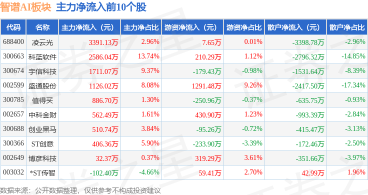 从资金流向上来看,当日智谱AI板块主力资金净流出17.61亿元,游资资金净流入5.88亿元,散户资金净流入11.74亿元。智谱AI板块个股资金流向见下表: