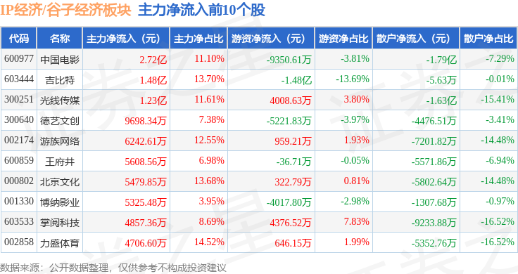 从资金流向上来看,当日IP经济/谷子经济板块主力资金净流出159.95万元,游资资金净流出4176.2万元,散户资金净流入4336.15万元。IP经济/谷子经济板块个股资金流向见下表: