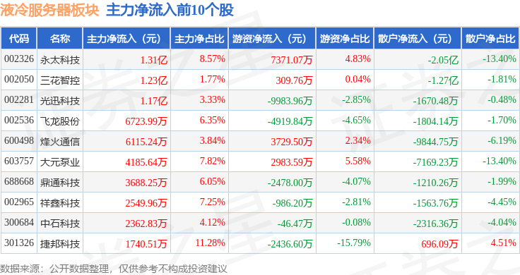 从资金流向上来看,当日液冷服务器板块主力资金净流出35.94亿元,游资资金净流入10.91亿元,散户资金净流入25.02亿元。液冷服务器板块个股资金流向见下表: