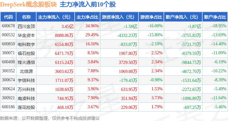 从资金流向上来看,当日DeepSeek概念股板块主力资金净流出21.61亿元,游资资金净流入4.64亿元,散户资金净流入16.98亿元。DeepSeek概念股板块个股资金流向见下表:
