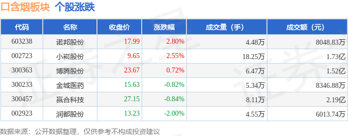 证券之星消息,12月10日口含烟板块较上一交易日下跌0.04%,润都股份领跌。当日上证指数报收于3900.5,下跌0.23%。深证成指报收于13316.42,上涨0.29%。口含烟板块个股涨跌见下表: