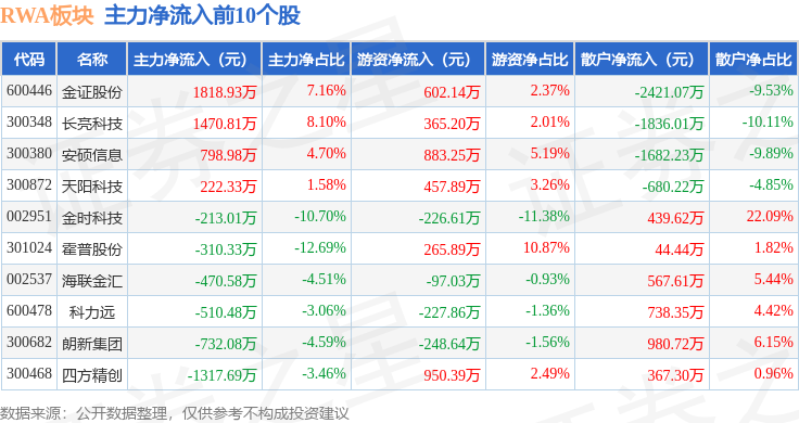 从资金流向上来看,当日RWA板块主力资金净流出1.59亿元,游资资金净流出1879.03万元,散户资金净流入1.78亿元。RWA板块个股资金流向见下表: