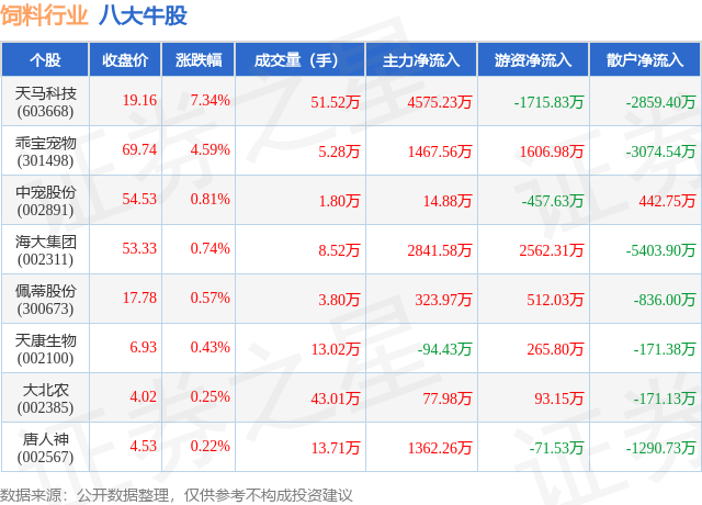 个股表现方面,饲料行业当日领涨股为天马科技(603668),该股当日报收19.16,上涨7.34%,成交量51.52万,主力资金净流入4575.23万元。乖宝宠物(301498)以上涨4.59%紧随其后,该股当日成交量5.28万,主力资金净流入1467.56万元。除此之外,中宠股份(002891)、海大集团(002311)、佩蒂股份(300673)均进入当日牛股之列。具体个股列表见下表: