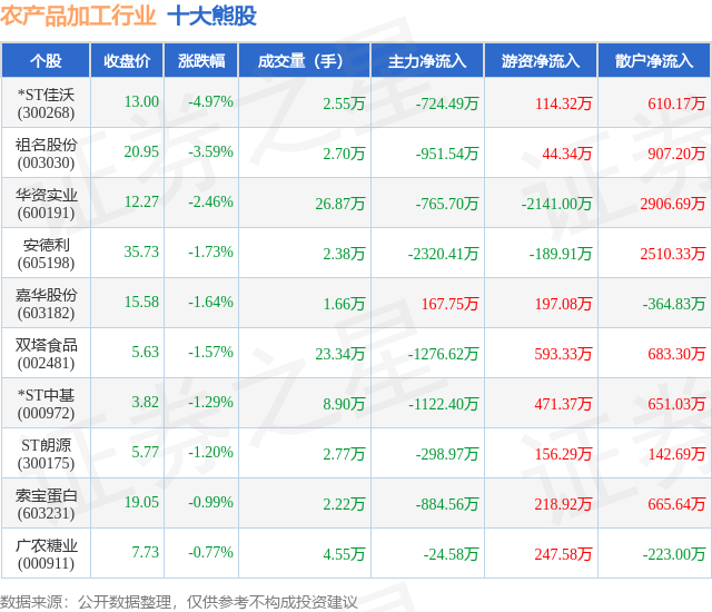 个股表现方面,农产品加工行业当日领跌股为*ST佳沃(300268),该股当日报收13.0,下跌4.97%,成交量2.55万,主力资金净流出724.49万元。祖名股份(003030)以下跌3.59%紧随其后,该股当日成交量2.7万,主力资金净流出951.54万元。除此之外,华资实业(600191)、安德利(605198)、嘉华股份(603182)均进入当日熊股之列。具体个股列表见下表: