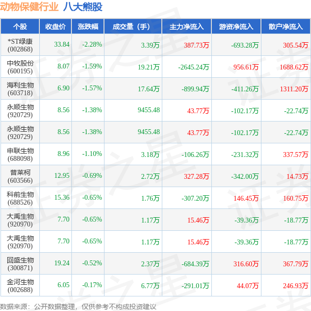 个股表现方面,动物保健行业当日领跌股为*ST绿康(002868),该股当日报收33.84,下跌2.28%,成交量3.39万,主力资金净流入387.73万元。中牧股份(600195)以下跌1.59%紧随其后,该股当日成交量19.21万,主力资金净流出2645.24万元。除此之外,海利生物(603718)、永顺生物(920729)、永顺生物(920729)均进入当日熊股之列。具体个股列表见下表: