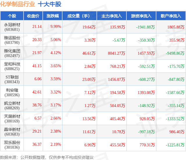 个股表现方面,化学制品行业当日领涨股为永冠新材(603681),该股当日报收21.14,上涨9.99%,成交量19.64万,主力资金净流入135.99万元。雅运股份(603790)以上涨5.06%紧随其后,该股当日成交量3.39万,主力资金净流出5.67万元。除此之外,雅化集团(002497)、呈和科技(688625)、ST联创(300343)均进入当日牛股之列。具体个股列表见下表: