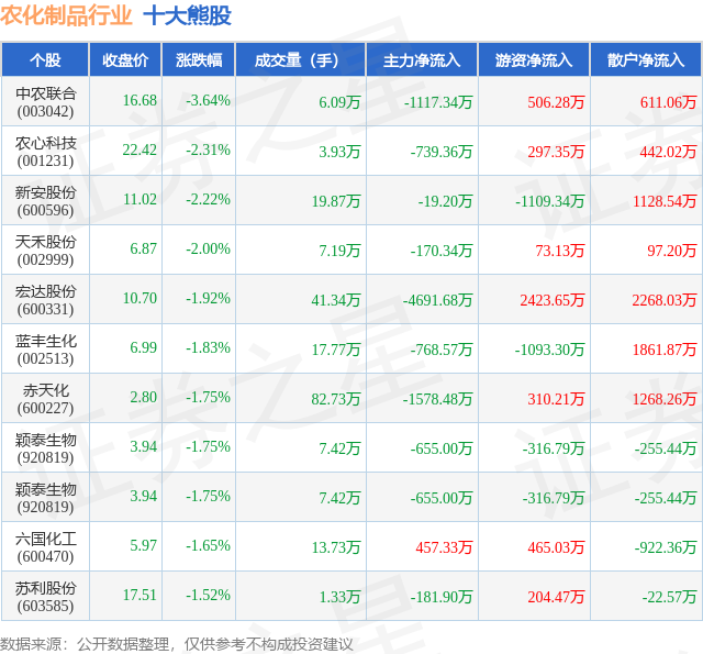 个股表现方面,农化制品行业当日领跌股为中农联合(003042),该股当日报收16.68,下跌3.64%,成交量6.09万,主力资金净流出1117.34万元。农心科技(001231)以下跌2.31%紧随其后,该股当日成交量3.93万,主力资金净流出739.36万元。除此之外,新安股份(600596)、天禾股份(002999)、宏达股份(600331)均进入当日熊股之列。具体个股列表见下表: