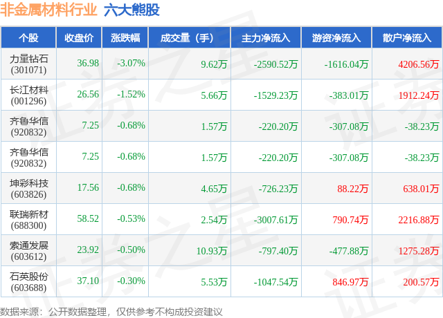 个股表现方面,非金属材料行业当日领跌股为力量钻石(301071),该股当日报收36.98,下跌3.07%,成交量9.62万,主力资金净流出2590.52万元。长江材料(001296)以下跌1.52%紧随其后,该股当日成交量5.66万,主力资金净流出1529.23万元。除此之外,齐鲁华信(920832)、齐鲁华信(920832)、坤彩科技(603826)均进入当日熊股之列。具体个股列表见下表: