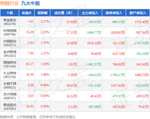 个股表现方面,特钢行业当日领涨股为常宝股份(002478),该股当日报收7.67,上涨2.27%,成交量27.04万,主力资金净流出765.85万元。中信特钢(000708)以上涨2.21%紧随其后,该股当日成交量17.25万,主力资金净流出1866.77万元。除此之外,沙钢股份(002075)、金洲管道(002443)、翔楼新材(301160)均进入当日牛股之列。具体个股列表见下表: