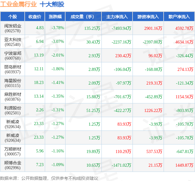 个股表现方面,工业金属行业当日领跌股为闽发铝业(002578),该股当日报收4.83,下跌3.78%,成交量135.25万,主力资金净流出7493.94万元。亚太科技(002540)以下跌3.07%紧随其后,该股当日成交量30.43万,主力资金净流出2237.16万元。除此之外,宁波富邦(600768)、丽岛新材(603937)、海星股份(603115)均进入当日熊股之列。具体个股列表见下表: