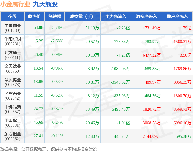 个股表现方面,小金属行业当日领跌股为中国铀业(001280),该股当日报收63.88,下跌5.78%,成交量51.1万,主力资金净流出2.26亿元。华阳新材(600281)以下跌2.63%紧随其后,该股当日成交量20.57万,主力资金净流出776.34万元。除此之外,北方稀土(600111)、金天钛业(688750)、章源钨业(002378)均进入当日熊股之列。具体个股列表见下表: