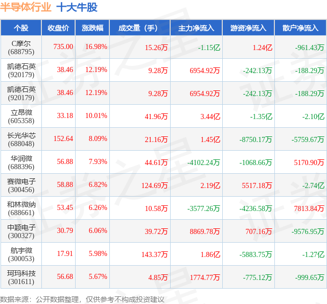 个股表现方面,半导体行业当日领涨股为C摩尔(688795),该股当日报收735.0,上涨16.98%,成交量15.26万,主力资金净流出1.15亿元。凯德石英(920179)以上涨12.19%紧随其后,该股当日成交量9.28万,主力资金净流入6954.92万元。除此之外,凯德石英(920179)、立昂微(605358)、长光华芯(688048)均进入当日牛股之列。具体个股列表见下表: