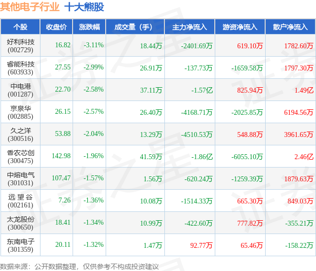 个股表现方面,其他电子行业当日领跌股为好利科技(002729),该股当日报收16.82,下跌3.11%,成交量18.44万,主力资金净流出2401.69万元。睿能科技(603933)以下跌2.99%紧随其后,该股当日成交量26.91万,主力资金净流出137.73万元。除此之外,中电港(001287)、京泉华(002885)、久之洋(300516)均进入当日熊股之列。具体个股列表见下表: