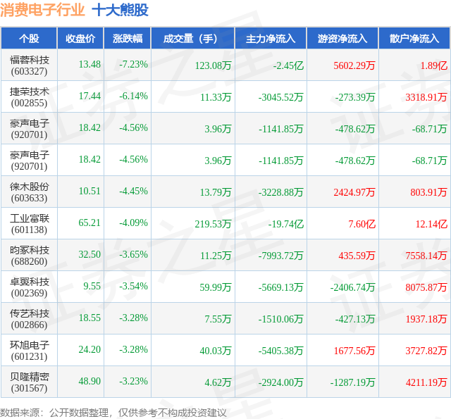 个股表现方面,消费电子行业当日领跌股为福蓉科技(603327),该股当日报收13.48,下跌7.23%,成交量123.08万,主力资金净流出2.45亿元。捷荣技术(002855)以下跌6.14%紧随其后,该股当日成交量11.33万,主力资金净流出3045.52万元。除此之外,豪声电子(920701)、豪声电子(920701)、徕木股份(603633)均进入当日熊股之列。具体个股列表见下表: