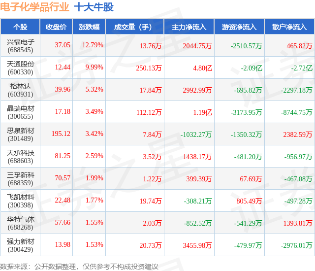 个股表现方面,电子化学品行业当日领涨股为兴福电子(688545),该股当日报收37.05,上涨12.79%,成交量13.76万,主力资金净流入2044.75万元。天通股份(600330)以上涨9.99%紧随其后,该股当日成交量250.13万,主力资金净流入4.8亿元。除此之外,格林达(603931)、晶瑞电材(300655)、思泉新材(301489)均进入当日牛股之列。具体个股列表见下表: