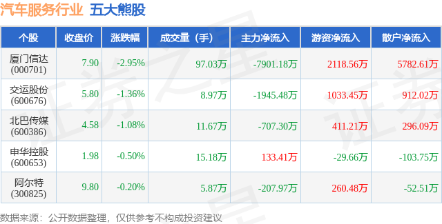 个股表现方面,汽车服务行业当日领跌股为厦门信达(000701),该股当日报收7.9,下跌2.95%,成交量97.03万,主力资金净流出7901.18万元。交运股份(600676)以下跌1.36%紧随其后,该股当日成交量8.97万,主力资金净流出1945.48万元。除此之外,北巴传媒(600386)、申华控股(600653)、阿尔特(300825)均进入当日熊股之列。具体个股列表见下表: