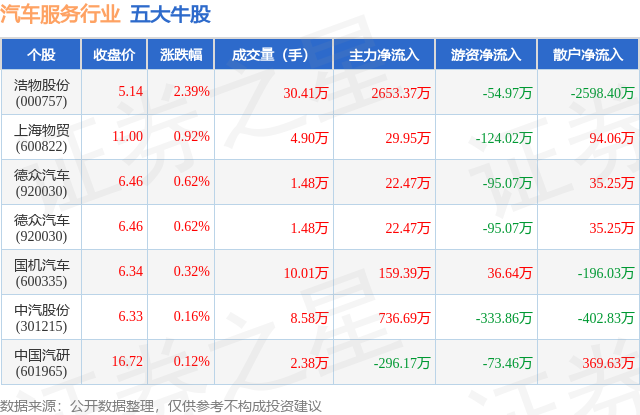 个股表现方面,汽车服务行业当日领涨股为浩物股份(000757),该股当日报收5.14,上涨2.39%,成交量30.41万,主力资金净流入2653.37万元。上海物贸(600822)以上涨0.92%紧随其后,该股当日成交量4.9万,主力资金净流入29.95万元。除此之外,德众汽车(920030)、德众汽车(920030)、国机汽车(600335)均进入当日牛股之列。具体个股列表见下表: