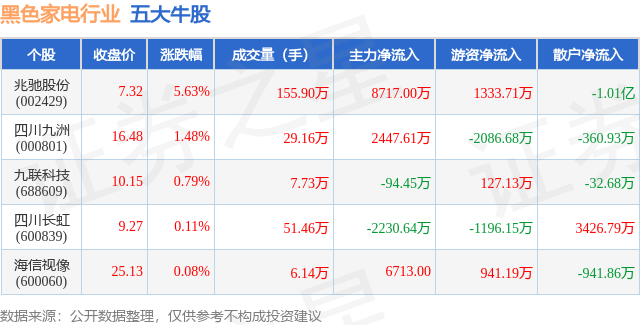 个股表现方面,黑色家电行业当日领涨股为兆驰股份(002429),该股当日报收7.32,上涨5.63%,成交量155.9万,主力资金净流入8717.0万元。四川九洲(000801)以上涨1.48%紧随其后,该股当日成交量29.16万,主力资金净流入2447.61万元。除此之外,九联科技(688609)、四川长虹(600839)、海信视像(600060)均进入当日牛股之列。具体个股列表见下表: