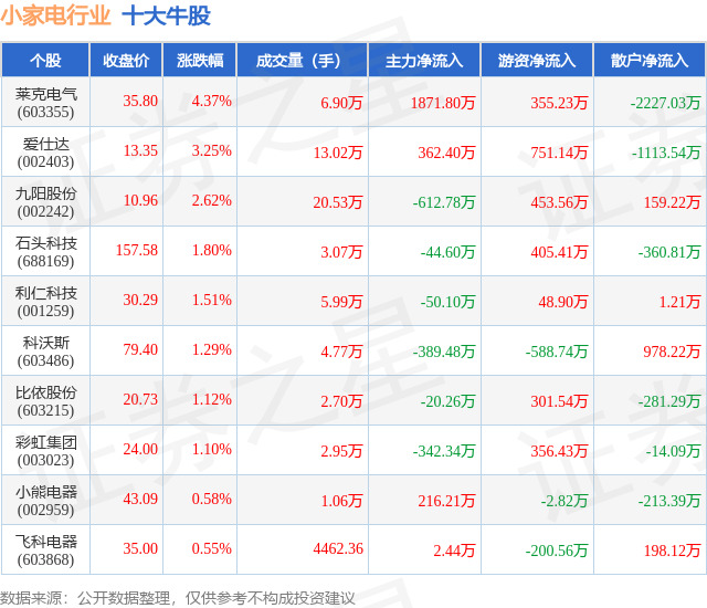 个股表现方面,小家电行业当日领涨股为莱克电气(603355),该股当日报收35.8,上涨4.37%,成交量6.9万,主力资金净流入1871.8万元。爱仕达(002403)以上涨3.25%紧随其后,该股当日成交量13.02万,主力资金净流入362.4万元。除此之外,九阳股份(002242)、石头科技(688169)、利仁科技(001259)均进入当日牛股之列。具体个股列表见下表: