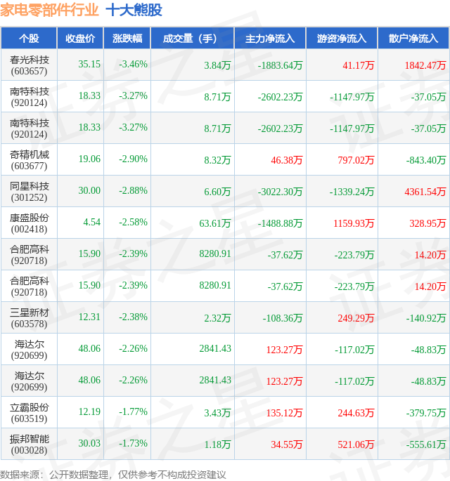 个股表现方面,家电零部件行业当日领跌股为春光科技(603657),该股当日报收35.15,下跌3.46%,成交量3.84万,主力资金净流出1883.64万元。南特科技(920124)以下跌3.27%紧随其后,该股当日成交量8.71万,主力资金净流出2602.23万元。除此之外,南特科技(920124)、奇精机械(603677)、同星科技(301252)均进入当日熊股之列。具体个股列表见下表: