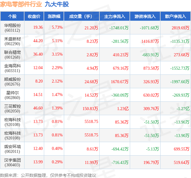 个股表现方面,家电零部件行业当日领涨股为华翔股份(603112),该股当日报收19.36,上涨5.73%,成交量21.2万,主力资金净流出1748.01万元。禾盛新材(002290)以上涨5.11%紧随其后,该股当日成交量8.23万,主力资金净流出281.56万元。除此之外,联合精密(001268)、金海高科(603311)、顺威股份(002676)均进入当日牛股之列。具体个股列表见下表: