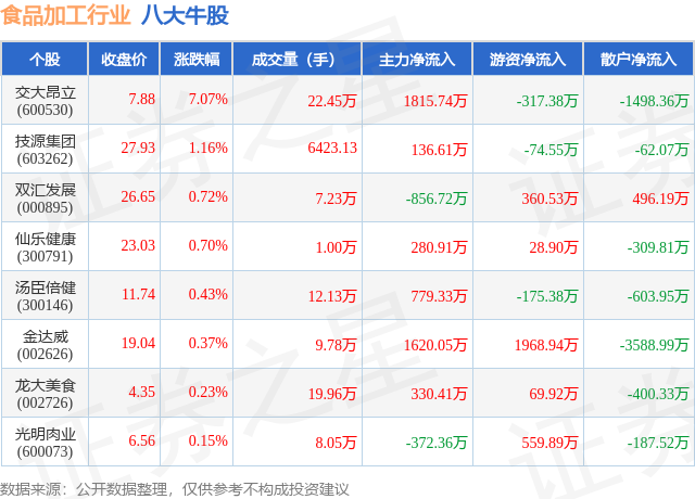 个股表现方面,食品加工行业当日领涨股为交大昂立(600530),该股当日报收7.88,上涨7.07%,成交量22.45万,主力资金净流入1815.74万元。技源集团(603262)以上涨1.16%紧随其后,该股当日成交量6423.0,主力资金净流入136.61万元。除此之外,双汇发展(000895)、仙乐健康(300791)、汤臣倍健(300146)均进入当日牛股之列。具体个股列表见下表: