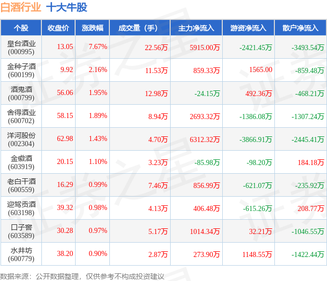 个股表现方面,白酒行业当日领涨股为皇台酒业(000995),该股当日报收13.05,上涨7.67%,成交量22.56万,主力资金净流入5915.0万元。金种子酒(600199)以上涨2.16%紧随其后,该股当日成交量11.53万,主力资金净流入859.33万元。除此之外,酒鬼酒(000799)、舍得酒业(600702)、洋河股份(002304)均进入当日牛股之列。具体个股列表见下表: