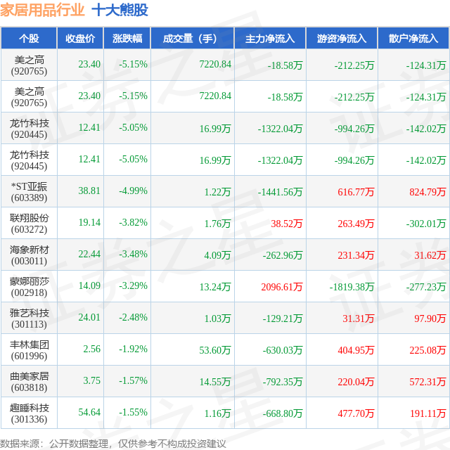 个股表现方面,家居用品行业当日领跌股为美之高(920765),该股当日报收23.4,下跌5.15%,成交量7221.0,主力资金净流出18.58万元。美之高(920765)以下跌5.15%紧随其后,该股当日成交量7221.0,主力资金净流出18.58万元。除此之外,龙竹科技(920445)、龙竹科技(920445)、*ST亚振(603389)均进入当日熊股之列。具体个股列表见下表: