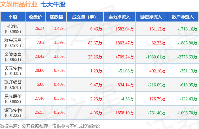 个股表现方面,文娱用品行业当日领涨股为英派斯(002899),该股当日报收26.34,上涨3.42%,成交量6.46万,主力资金净流入1582.04万元。群兴玩具(002575)以上涨3.39%紧随其后,该股当日成交量83.67万,主力资金净流入1803.47万元。除此之外,金陵体育(300651)、天元宠物(301335)、珠江钢琴(002678)均进入当日牛股之列。具体个股列表见下表: