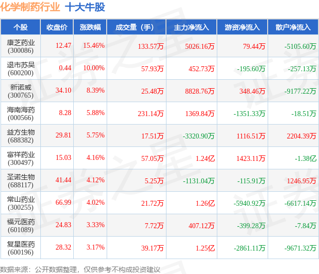 个股表现方面,化学制药行业当日领涨股为康芝药业(300086),该股当日报收12.47,上涨15.46%,成交量133.57万,主力资金净流入5026.16万元。退市苏吴(600200)以上涨10.0%紧随其后,该股当日成交量57.93万,主力资金净流入452.73万元。除此之外,新诺威(300765)、海南海药(000566)、益方生物(688382)均进入当日牛股之列。具体个股列表见下表: