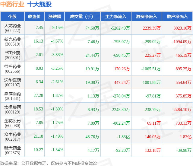 个股表现方面,中药行业当日领跌股为太龙药业(600222),该股当日报收7.45,下跌9.15%,成交量74.6万,主力资金净流出5262.49万元。新光药业(300519)以下跌4.67%紧随其后,该股当日成交量7.46万,主力资金净流出795.07万元。除此之外,*ST长药(300391)、益盛药业(002566)、沃华医药(002107)均进入当日熊股之列。具体个股列表见下表: