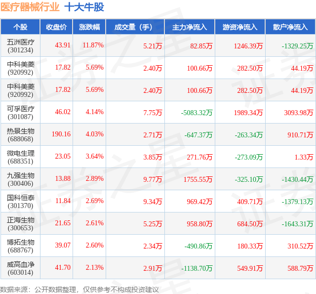 个股表现方面,医疗器械行业当日领涨股为五洲医疗(301234),该股当日报收43.91,上涨11.87%,成交量5.21万,主力资金净流入82.85万元。中科美菱(920992)以上涨5.69%紧随其后,该股当日成交量2.4万,主力资金净流入100.66万元。除此之外,中科美菱(920992)、可孚医疗(301087)、热景生物(688068)均进入当日牛股之列。具体个股列表见下表: