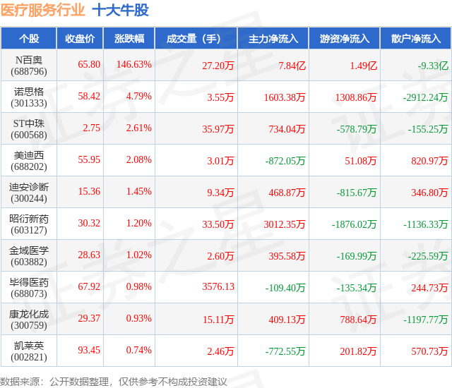 个股表现方面,医疗服务行业当日领涨股为N百奥(688796),该股当日报收65.8,上涨146.63%,成交量27.2万,主力资金净流入7.84亿元。诺思格(301333)以上涨4.79%紧随其后,该股当日成交量3.55万,主力资金净流入1603.38万元。除此之外,ST中珠(600568)、美迪西(688202)、迪安诊断(300244)均进入当日牛股之列。具体个股列表见下表: