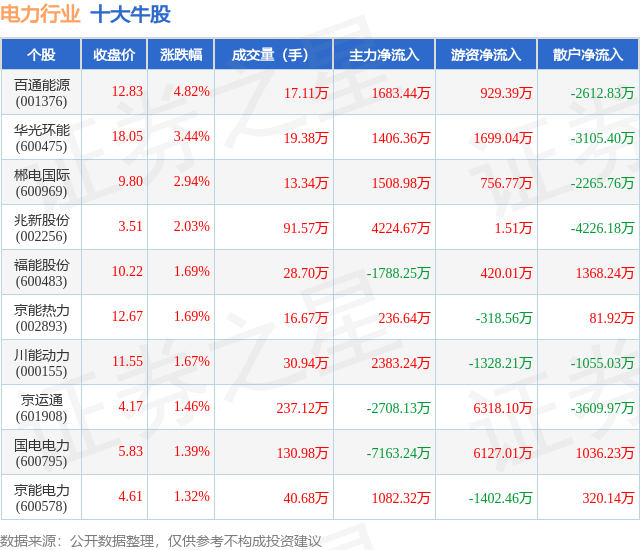 个股表现方面,电力行业当日领涨股为百通能源(001376),该股当日报收12.83,上涨4.82%,成交量17.11万,主力资金净流入1683.44万元。华光环能(600475)以上涨3.44%紧随其后,该股当日成交量19.38万,主力资金净流入1406.36万元。除此之外,郴电国际(600969)、兆新股份(002256)、福能股份(600483)均进入当日牛股之列。具体个股列表见下表: