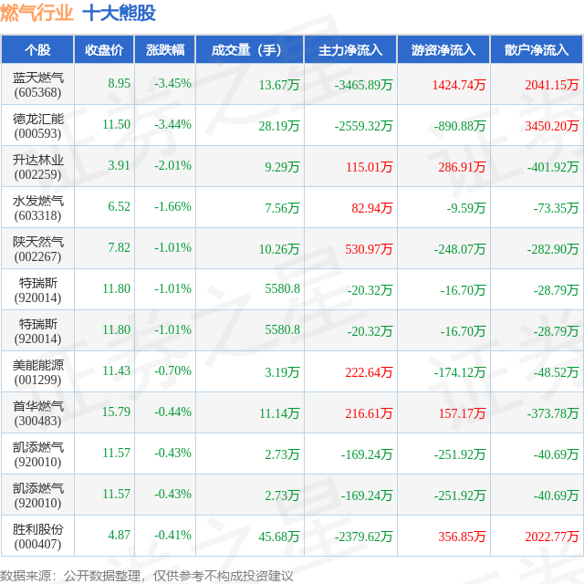 个股表现方面,燃气行业当日领跌股为蓝天燃气(605368),该股当日报收8.95,下跌3.45%,成交量13.67万,主力资金净流出3465.89万元。德龙汇能(000593)以下跌3.44%紧随其后,该股当日成交量28.19万,主力资金净流出2559.32万元。除此之外,升达林业(002259)、水发燃气(603318)、陕天然气(002267)均进入当日熊股之列。具体个股列表见下表: