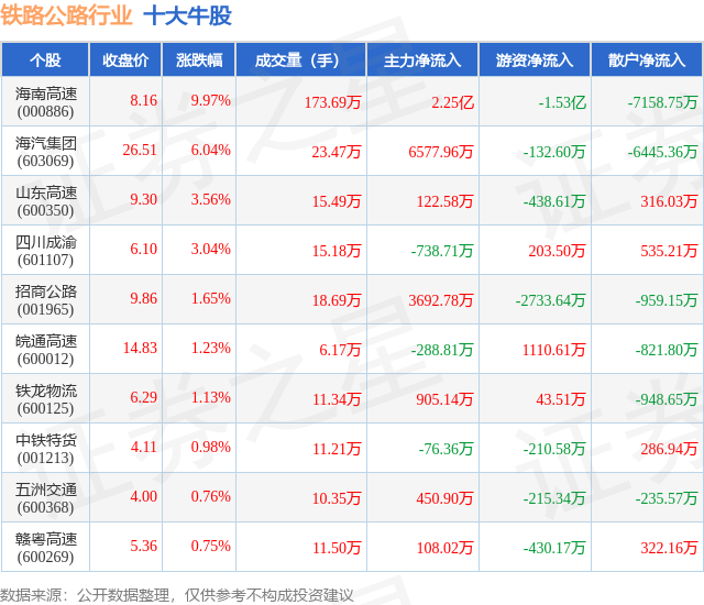 个股表现方面,铁路公路行业当日领涨股为海南高速(000886),该股当日报收8.16,上涨9.97%,成交量173.69万,主力资金净流入2.25亿元。海汽集团(603069)以上涨6.04%紧随其后,该股当日成交量23.47万,主力资金净流入6577.96万元。除此之外,山东高速(600350)、四川成渝(601107)、招商公路(001965)均进入当日牛股之列。具体个股列表见下表: