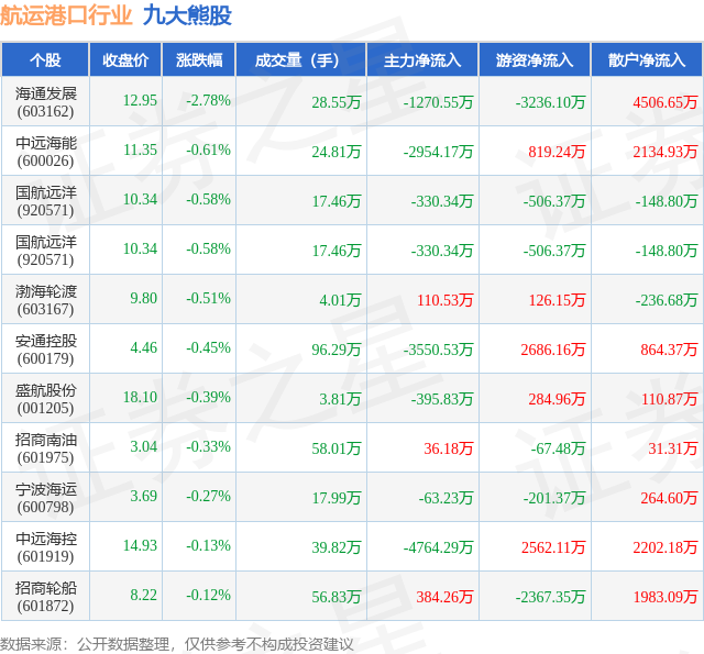个股表现方面,航运港口行业当日领跌股为海通发展(603162),该股当日报收12.95,下跌2.78%,成交量28.55万,主力资金净流出1270.55万元。中远海能(600026)以下跌0.61%紧随其后,该股当日成交量24.81万,主力资金净流出2954.17万元。除此之外,国航远洋(920571)、国航远洋(920571)、渤海轮渡(603167)均进入当日熊股之列。具体个股列表见下表: