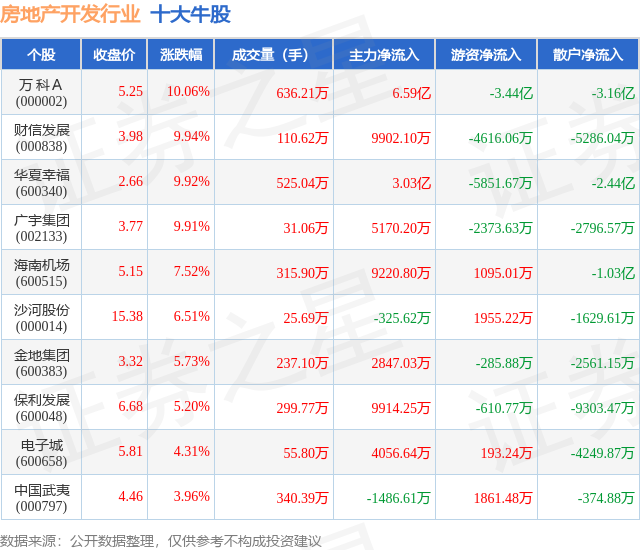 个股表现方面,房地产开发行业当日领涨股为万 科A(000002),该股当日报收5.25,上涨10.06%,成交量636.21万,主力资金净流入6.59亿元。财信发展(000838)以上涨9.94%紧随其后,该股当日成交量110.62万,主力资金净流入9902.1万元。除此之外,华夏幸福(600340)、广宇集团(002133)、海南机场(600515)均进入当日牛股之列。具体个股列表见下表:
