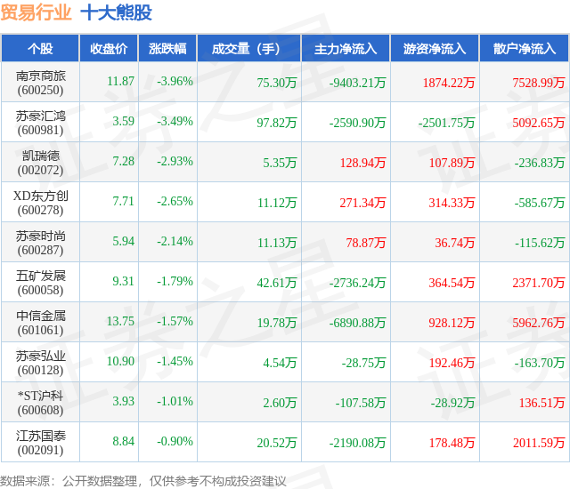 个股表现方面,贸易行业当日领跌股为南京商旅(600250),该股当日报收11.87,下跌3.96%,成交量75.3万,主力资金净流出9403.21万元。苏豪汇鸿(600981)以下跌3.49%紧随其后,该股当日成交量97.82万,主力资金净流出2590.9万元。除此之外,凯瑞德(002072)、XD东方创(600278)、苏豪时尚(600287)均进入当日熊股之列。具体个股列表见下表: