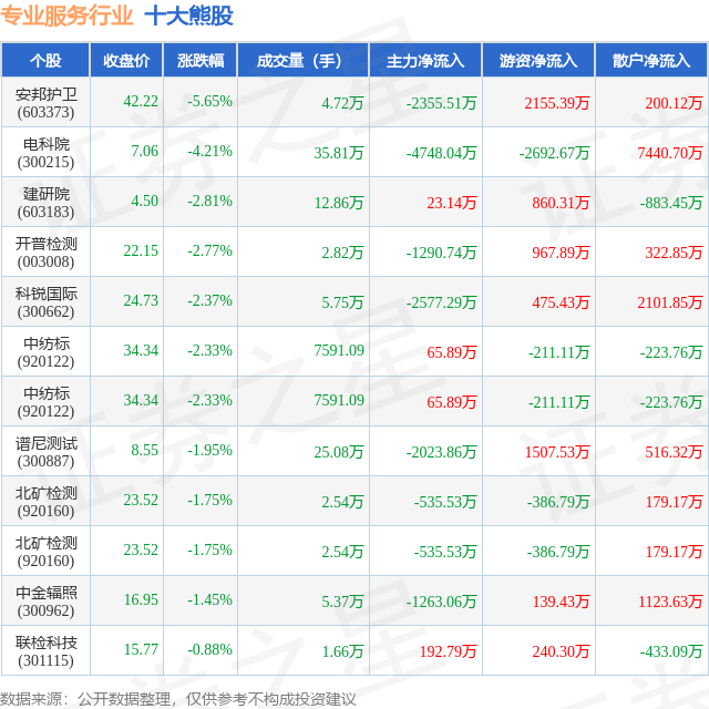 个股表现方面,专业服务行业当日领跌股为安邦护卫(603373),该股当日报收42.22,下跌5.65%,成交量4.72万,主力资金净流出2355.51万元。电科院(300215)以下跌4.21%紧随其后,该股当日成交量35.81万,主力资金净流出4748.04万元。除此之外,建研院(603183)、开普检测(003008)、科锐国际(300662)均进入当日熊股之列。具体个股列表见下表: