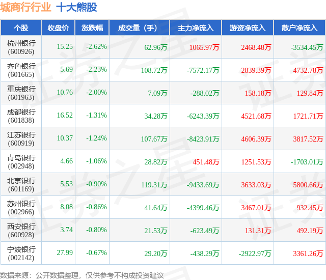 个股表现方面,城商行行业当日领跌股为杭州银行(600926),该股当日报收15.25,下跌2.62%,成交量62.96万,主力资金净流入1065.97万元。齐鲁银行(601665)以下跌2.23%紧随其后,该股当日成交量108.72万,主力资金净流出7572.17万元。除此之外,重庆银行(601963)、成都银行(601838)、江苏银行(600919)均进入当日熊股之列。具体个股列表见下表: