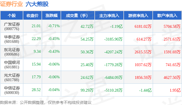个股表现方面,证券行业当日领跌股为广发证券(000776),该股当日报收21.01,下跌0.71%,成交量42.72万,主力资金净流出1.19亿元。华泰证券(601688)以下跌0.45%紧随其后,该股当日成交量54.25万,主力资金净流出3185.9万元。除此之外,东北证券(000686)、中国银河(601881)、光大证券(601788)均进入当日熊股之列。具体个股列表见下表: