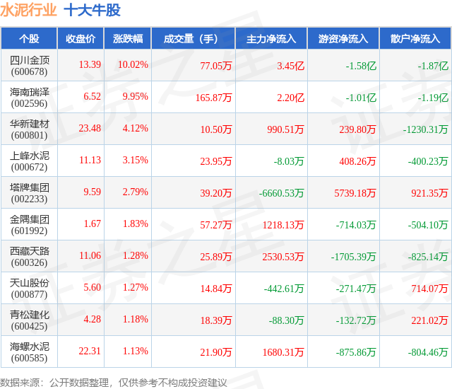 个股表现方面,水泥行业当日领涨股为四川金顶(600678),该股当日报收13.39,上涨10.02%,成交量77.05万,主力资金净流入3.45亿元。海南瑞泽(002596)以上涨9.95%紧随其后,该股当日成交量165.87万,主力资金净流入2.2亿元。除此之外,华新建材(600801)、上峰水泥(000672)、塔牌集团(002233)均进入当日牛股之列。具体个股列表见下表: